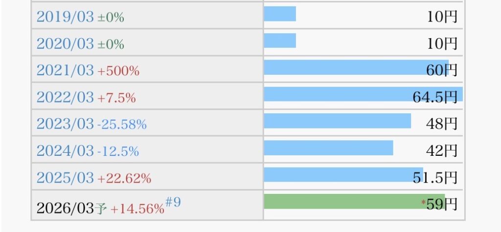 「利益が出た時だけ配当を出す」のではなく、「会社が持っている資産(資本)に対して何%出す」という基準(DOE)を設けています。これにより、多少業績がブレても配当が非常に安定します。 2026年3月期の配当: 前期からさらに増配の59円(予想)。利回りは5%前後と、非常に甘く魅力的な水準です。